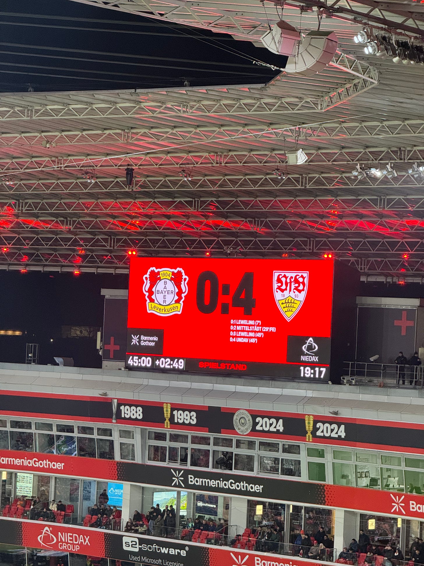 Jamie Leweling cu o dublă, Max Mittelstädt din penalty și Deniz Undav în prelunigirile primei reprize au stabilit scorul pauzei, fiind pentru prima dată din 1995 când șvabii îi dau patru goluri lui Bayer. Ultima dată când s-a întâmplat asta, Ioan Lupescu a fost pe teren pentru Leverkusen și brazilianul Giovane Élber dădea două goluri pentru VfB.